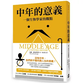 但其實這不是危機,而是人生的轉機。《中年的意義: 一個生物學家的觀點 》這本書不斷強調一個觀點:中年並非是青春期到老年期的過度,而是經過物競天擇,極具存在意義的重要階段。身為獸醫的大衛.班布里基從生物學切入,大量的實驗過程、成果及科學數據,告訴我們中年在生物學、社會上的重要意義,以及身理改變對中年人行為、心理上帶來的影響。